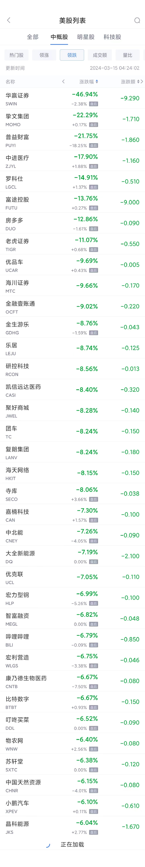 下跌股当中,华赢证券跌46.94%,挚文集团跌22.29%,普益财富跌21.75%,中进医疗跌17.90%,罗科仕跌14.91%,富途控股跌13.76%,老虎证券跌11.07%,雅乐科技跌跌7.87%,大健云仓跌7.68%,亿航跌7.41%,嘉楠科技跌7.30%,大全新能源跌7.19%,哔哩哔哩跌6.79%,比特数字跌6.67%,叮咚买菜跌6.52%,小鹏汽车跌6.10%,晶科能源跌6.04%。